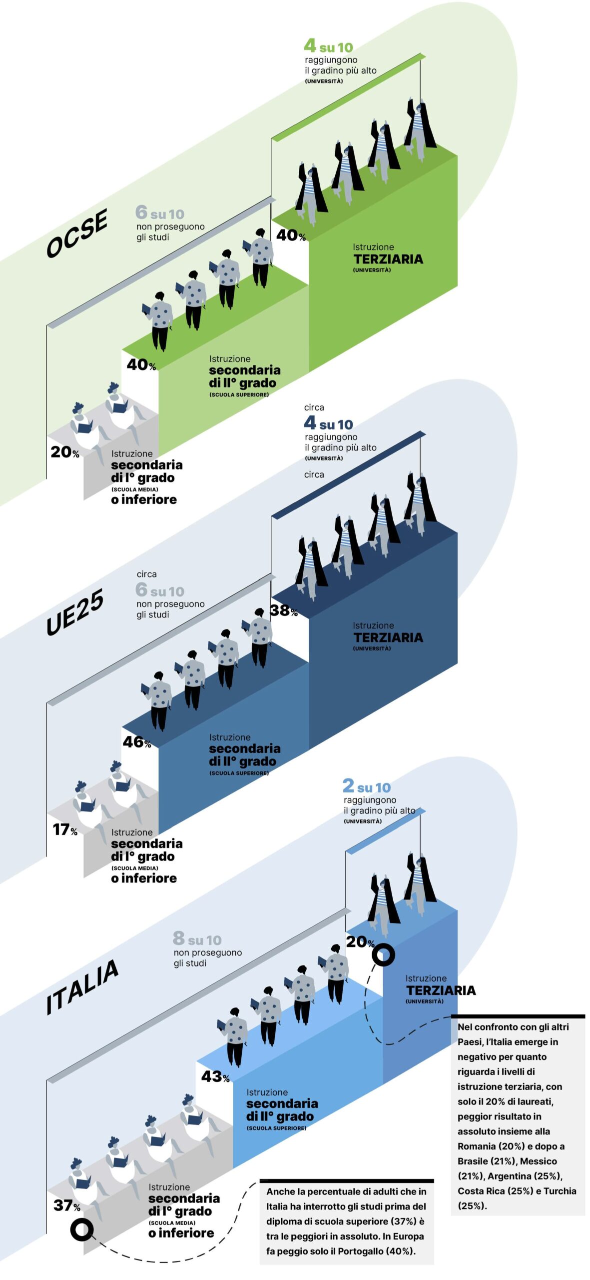 In media, in Europa e nei paesi OCSE circa il 40% degli adulti tra i 25 e i 64 anni ha raggiunto un livello di istruzione terziaria. Il resto della popolazione adulta si divide tra un 40-45% che ha raggiunto almeno un diploma di scuola secondaria (o un altro titolo equivalente), e un restante 15-20% che ha terminato gli studi prima. L’Italia registra un evidente ritardo rispetto a questi numeri.